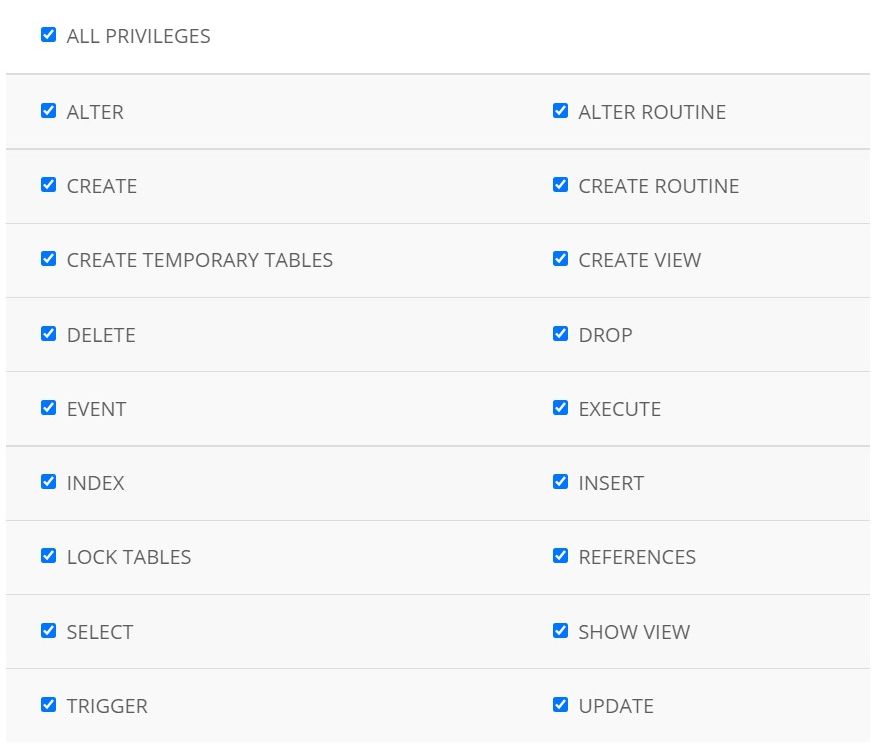Open MySQL Databases page, create a new MySQL database, create a new user and add the user to the database selecting All privileges like this: