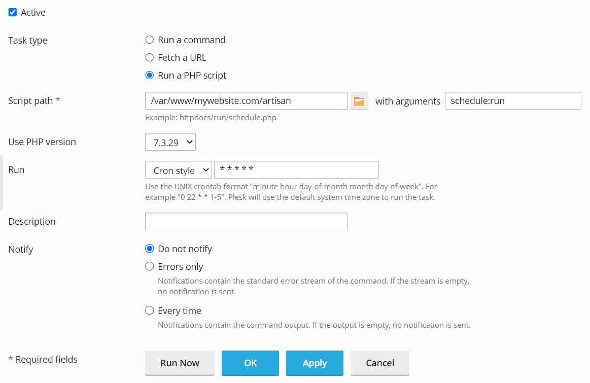 Add a new cron (scheduled) job to your server. The cron job parameters are provided after successful installation of the application and on the Backend » Maintenance page. The cron job can be added by executing crontab -e and pasting the command.